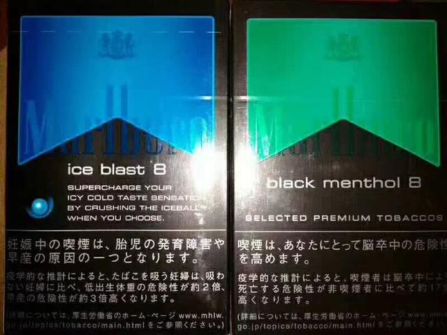 日本最最经典的一款万宝路当要数这款黑冰了,话说中国也有这款,但是细腻程度还是不及日本的这款黑冰,右边的是黑绿不带爆珠的薄荷款。