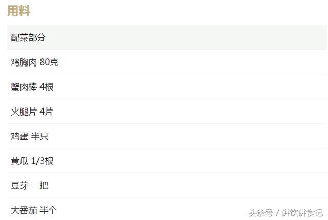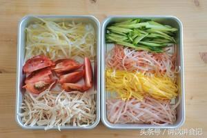 1.鸡胸煮熟后晾凉撕成丝;鸡蛋入平底锅摊成蛋皮后切丝;蟹肉棒撕成丝;火腿片切成丝;黄瓜切成丝;豆芽入锅焯熟;番茄切片。