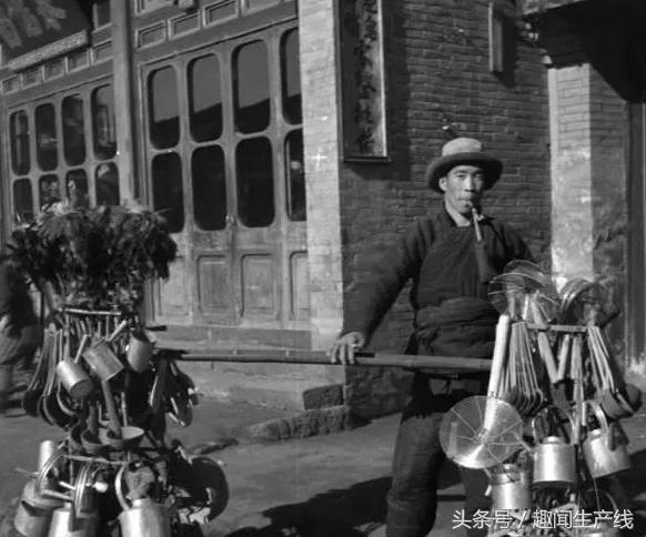 这个是卖五金的小贩,民国那个时候,五金就是直接挑出来卖的,他是怎么都放在一个棍子上的?(yancaoye.comyancaoye.com)