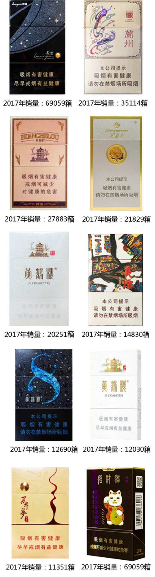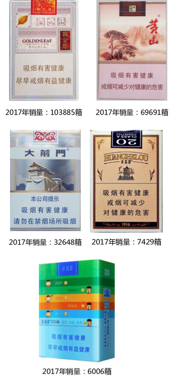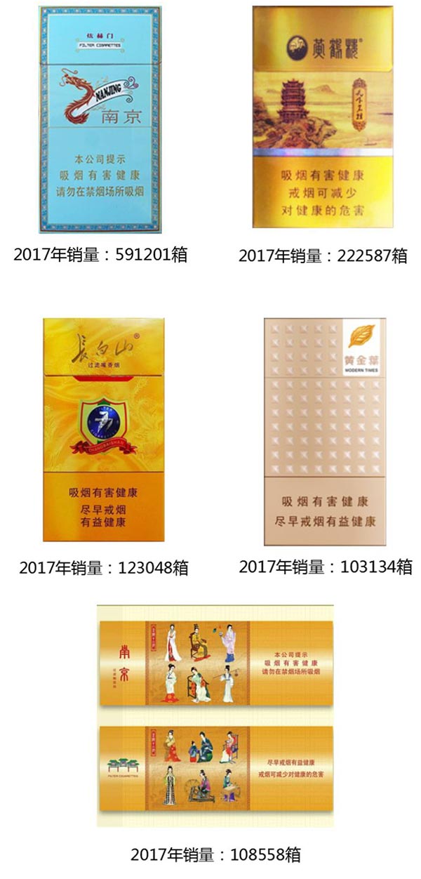 2017年细支烟销量共计230.5万箱,其中有5款卷烟商业销量超过10万箱。分别是南京(炫赫门)、黄鹤楼(天下名楼)、长白山(777)、黄金叶(爱尚)、南京(十二钗烤烟)。