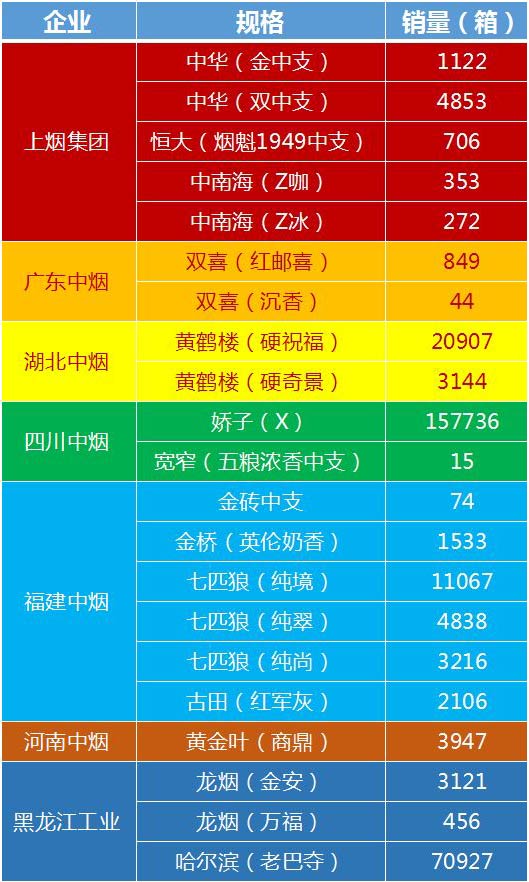 2017年是中支烟发展的元年,在中华带领下各大品牌纷纷切入细分品类,给烟草行业带来一阵新风。以下为部分工业企业中支烟商业销量情况。